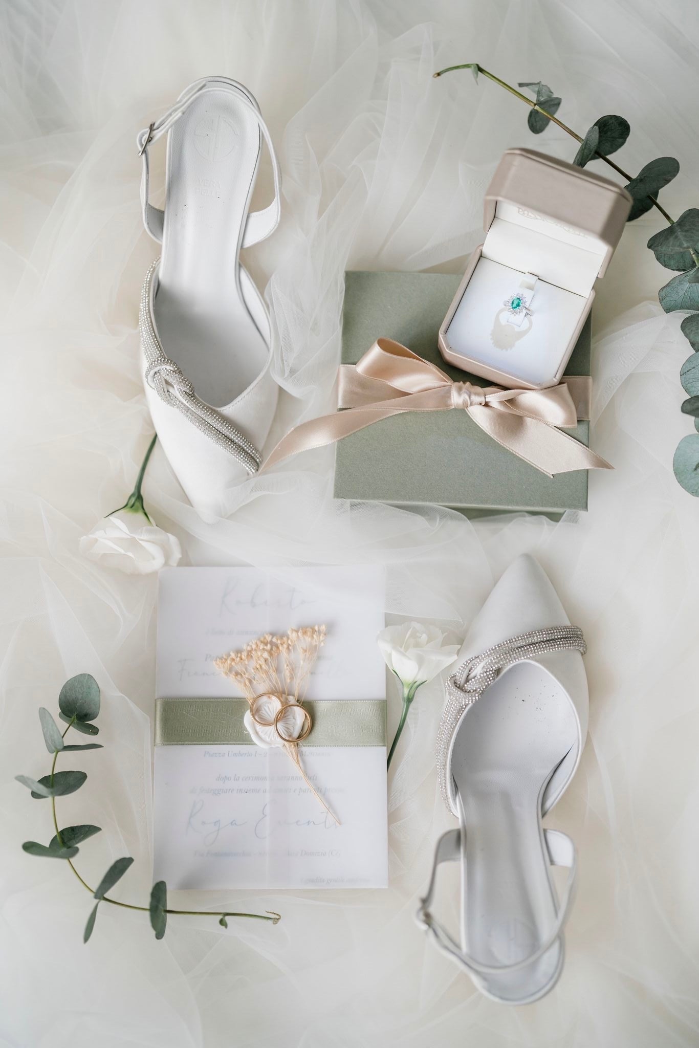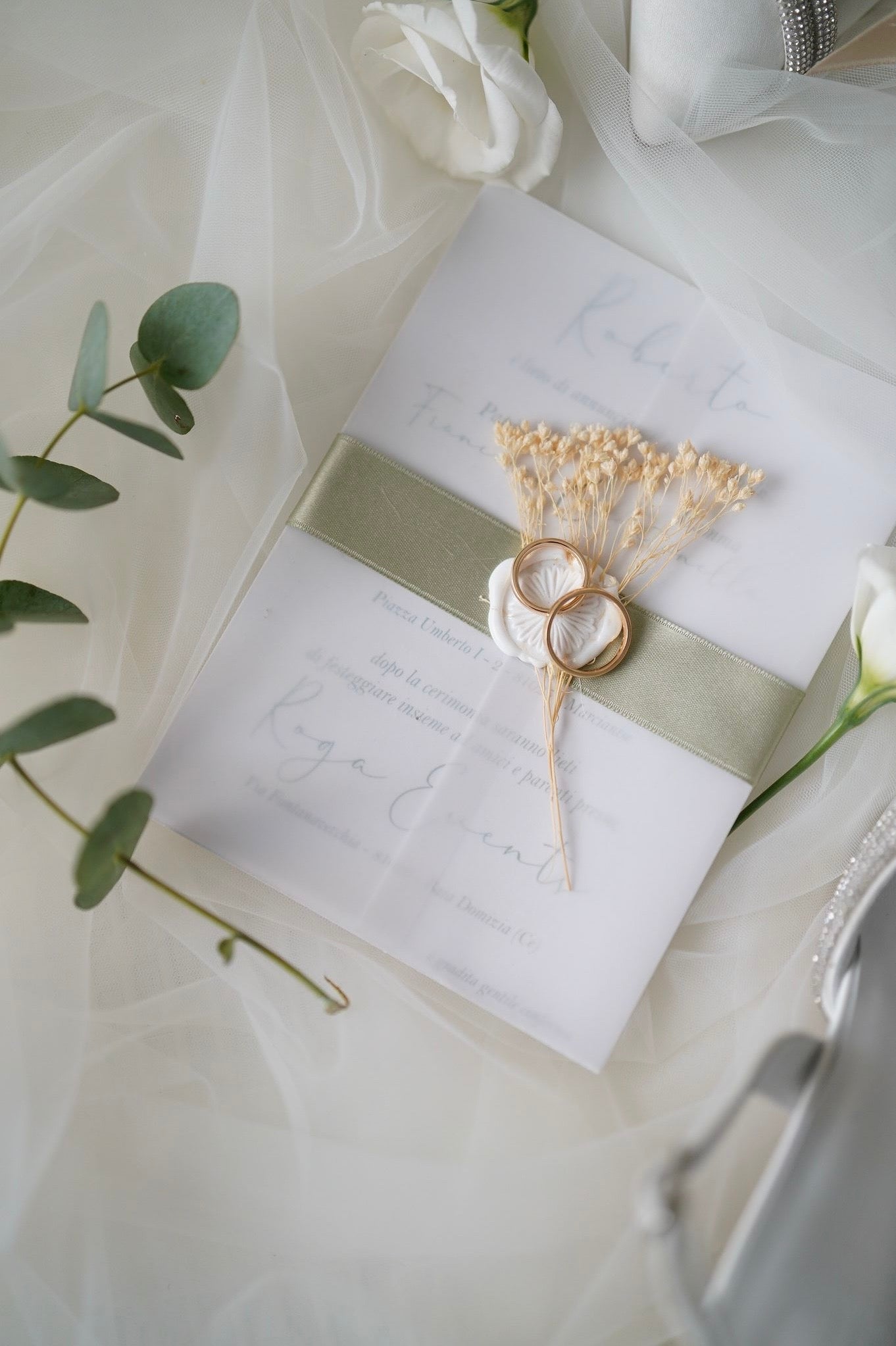 La partecipazione è realizzata in carta traslucida che avvolge il testo stampato, creando un effetto sofisticato e leggero. È impreziosita da un nastro verde salvia in tessuto che racchiude l’invito e decorata con un piccolo mazzolino di fiori secchi e un sigillo in cera dal design botanico.